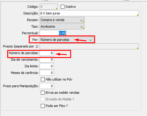 - Número de parcelas: define a quantidade de parcelas;