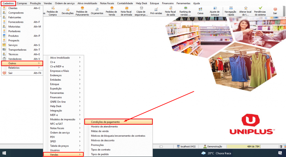 Condições de pagamento são as regras definidas pelo estabelecimento comercial que definem em quanto tempo os consumidores vão pagar pelos produtos ou serviços adquiridos. Por exemplo, uma venda pode ser paga à vista ou parcelada com prestações mensais. O Uniplus oferece um cadastro onde o lojista pode incluir uma quantidade ilimitada de condições, de acordo com sua necessidade.