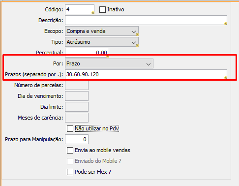 - Prazos: aplicável somente para campo “Por Prazo”. Defina os prazos calculados a partir da emissão separados por um “.” (ponto). Sendo assim, o sistema ajustará conforme os períodos informados. EX: 5. 10. 15. 20. 25. 30 – neste cenário seria calculada a condição em 6 parcelas, com intervalo de 5 dias entre cada uma.