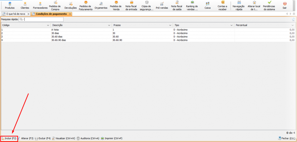 Caso você deseje incluir uma nova condição de pagamento, basta clicar no botão [Incluir (F2)] e preencher os campos solicitados.