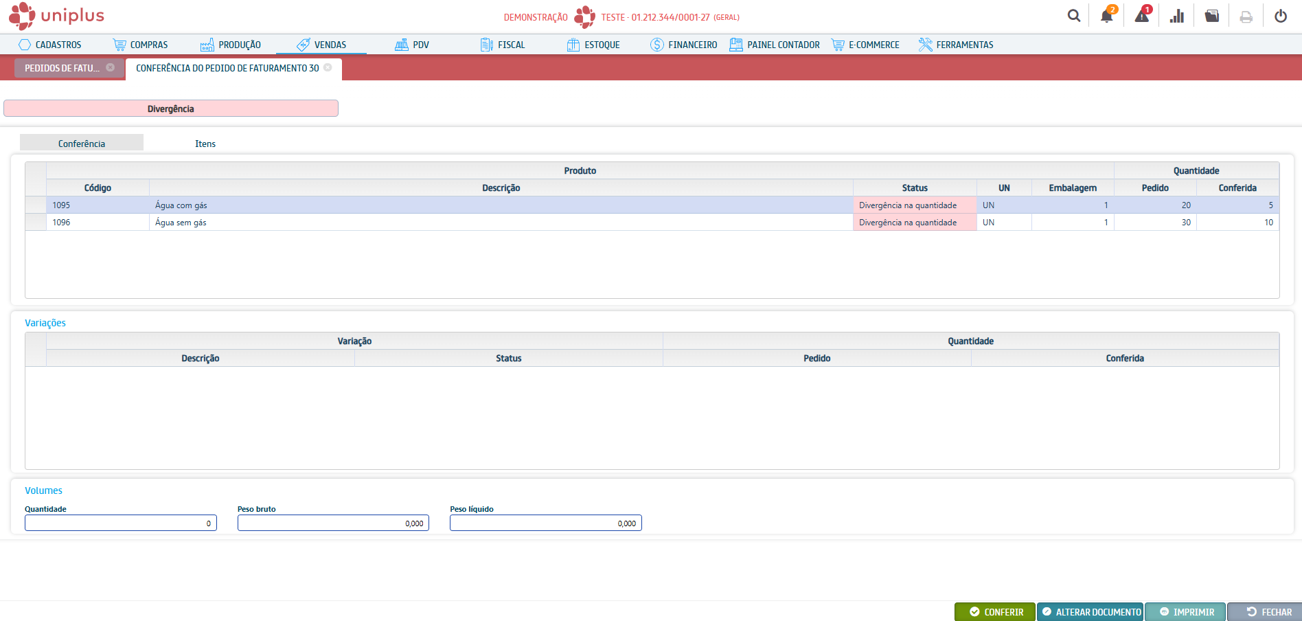 Na tela principal de pedido de faturamento terá o botão [Conferência], que permite editar a quantidade de volumes do pedido. As alterações feitas nessa etapa serão registradas no pedido e refletidas na emissão da nota fiscal.