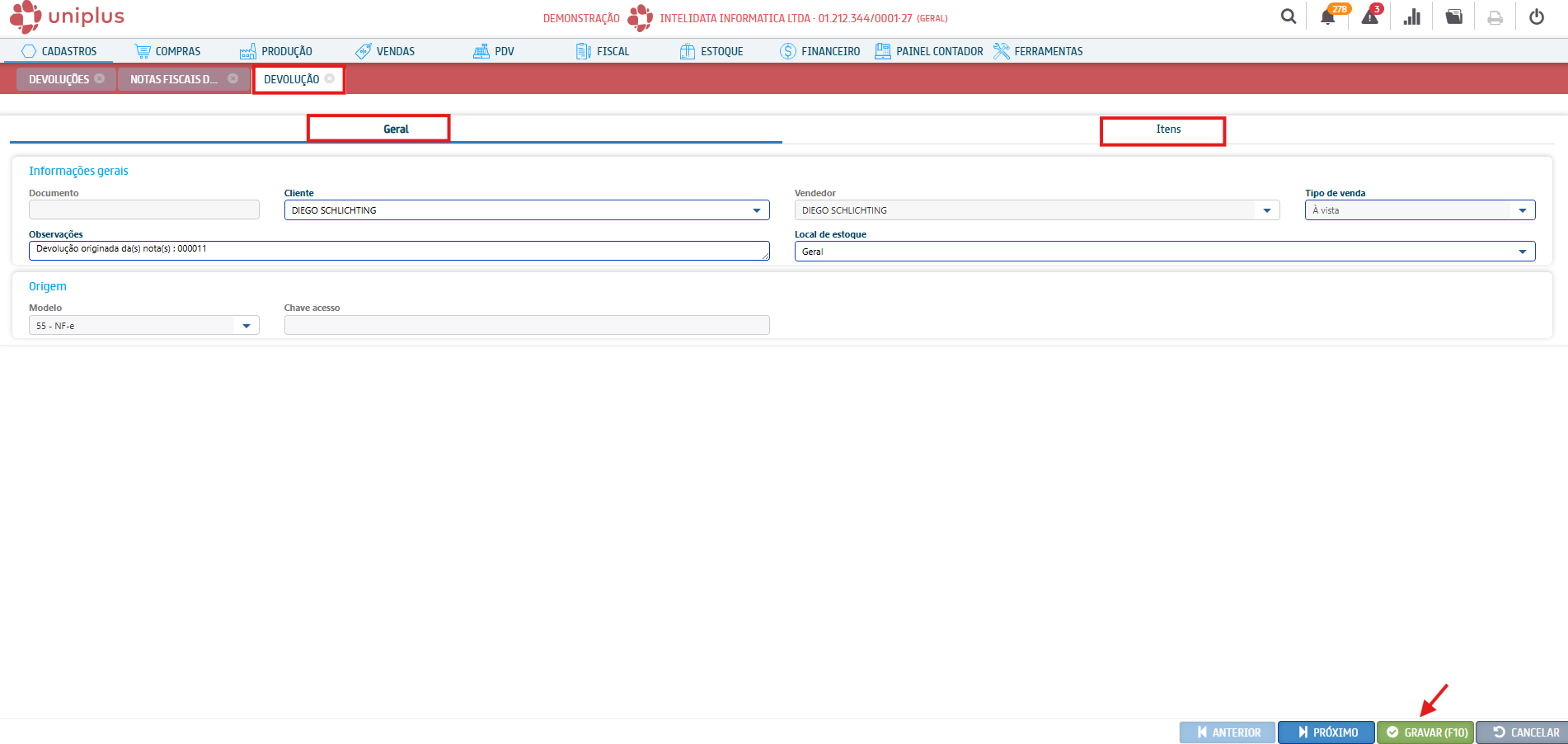 Confira todas as informações das abas Geral e Itens, estando tudo ok, clique em [Gravar (F10)];