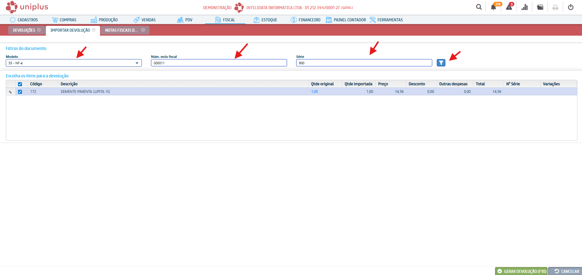 Após terminar as configurações de importação, será aberta a tela da devolução.