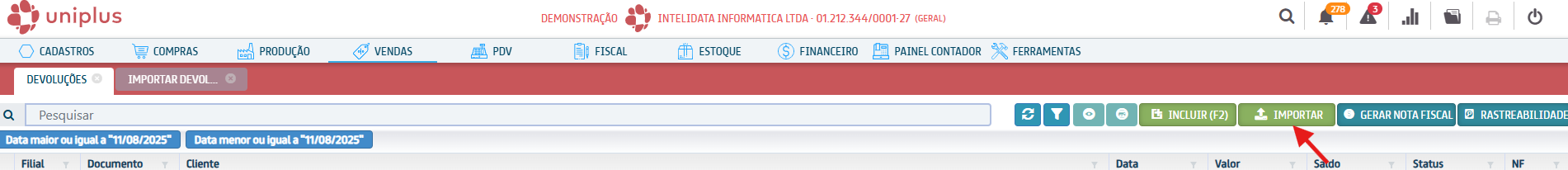 No Uniplus acesse o menu Vendas → Devoluções → Importar: