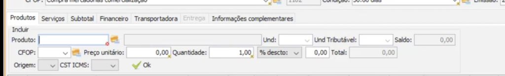 Na aba Produtos, inclua as mercadorias adquiridas.