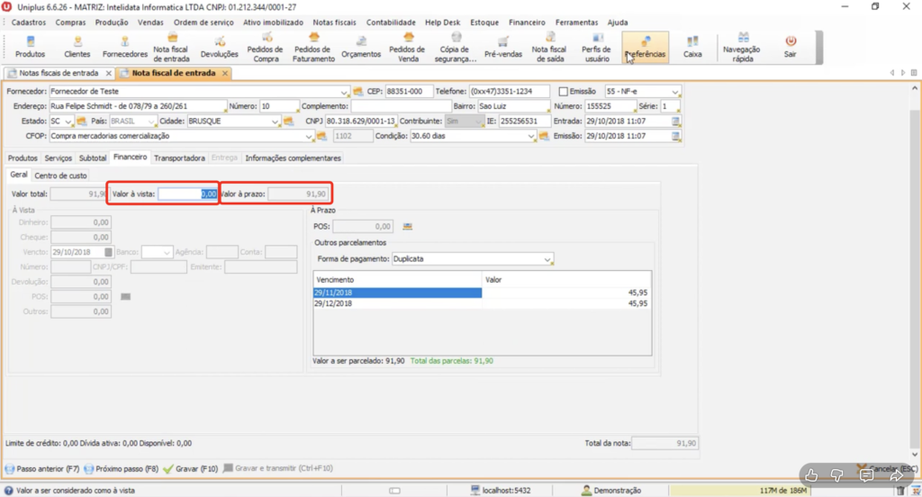 Nesta tela você seleciona os dados como o fornecedor, que deve estar cadastrado e com a opção Fornecedor marcada.