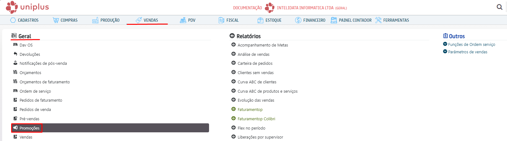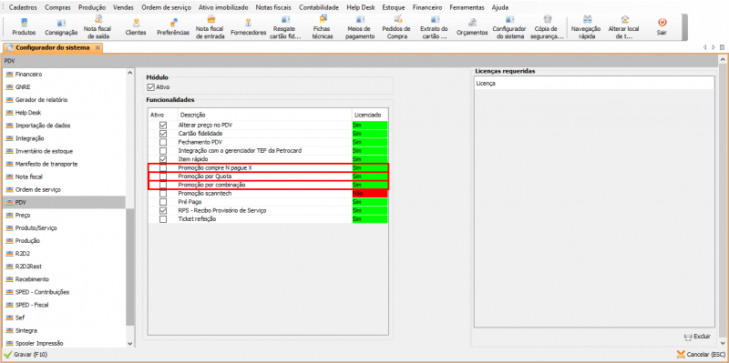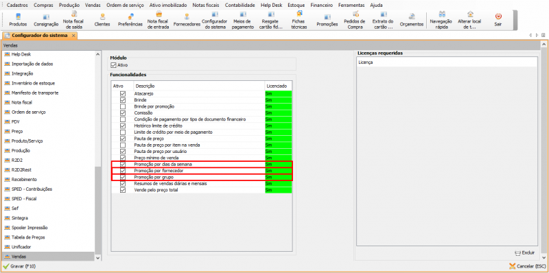 Para utilizar as promoções, é necessário ativar as funcionalidades em Ferramentas → Configurador do sistema. Ative cada uma conforme desejado.