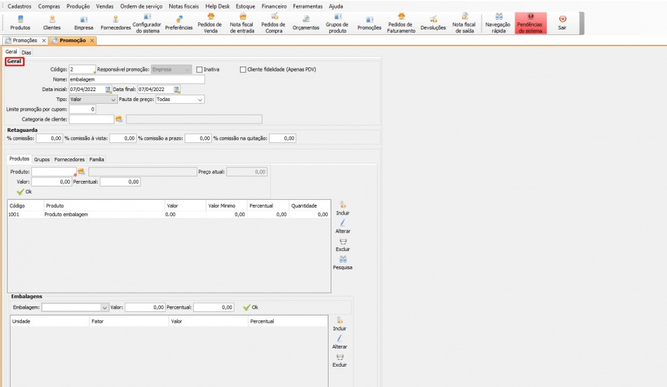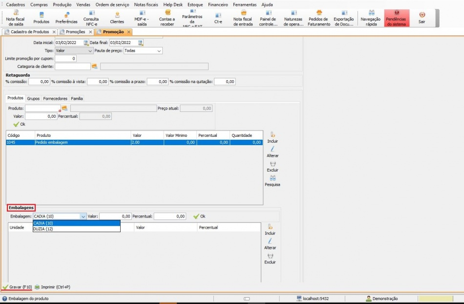 - Embalagem: selecione qual embalagem entrará na promoção;