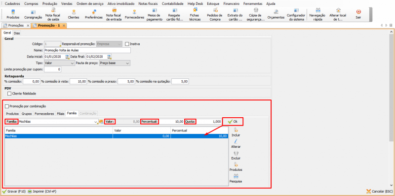 1- Na aba Família, há dois métodos de adicionar uma família de produtos na promoção: desconto no valor e desconto percentual. Nesse exemplo será usado o método de promoção percentual. Ao preencher um dos campos, o outro será desabilitado. Faça então as seguintes configurações: