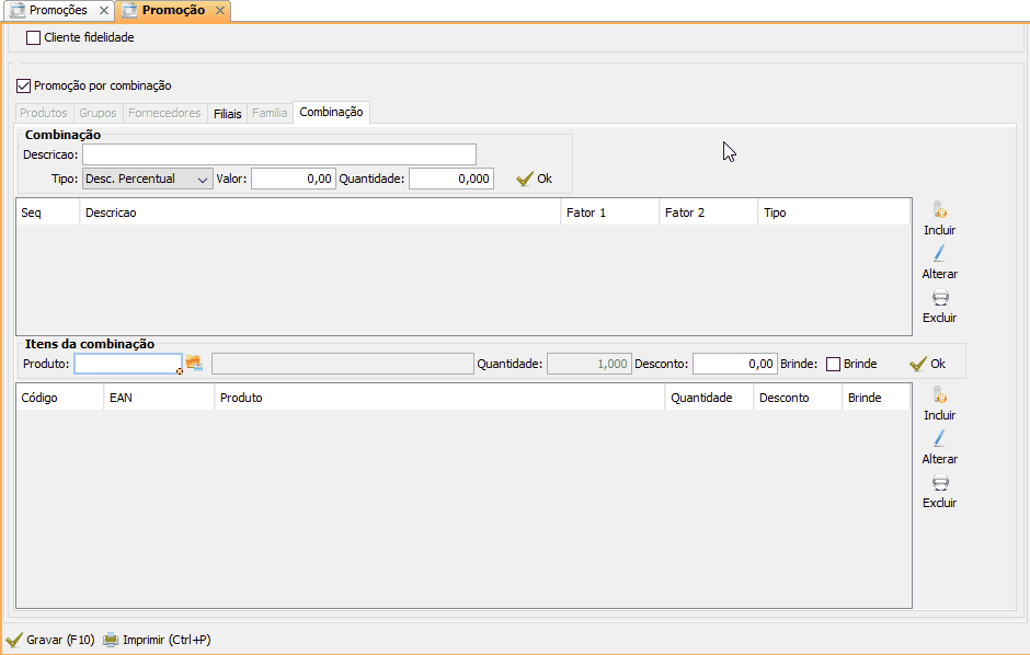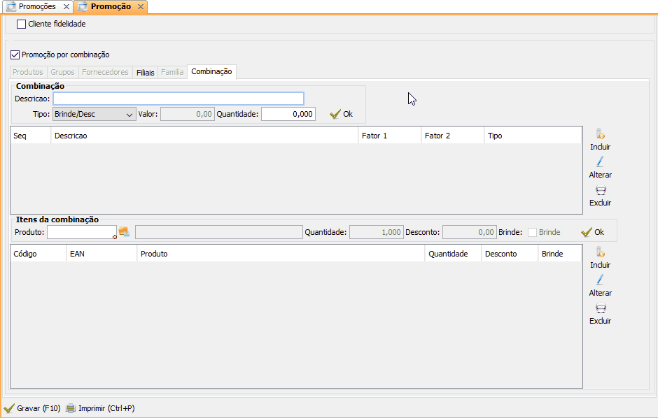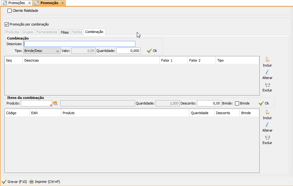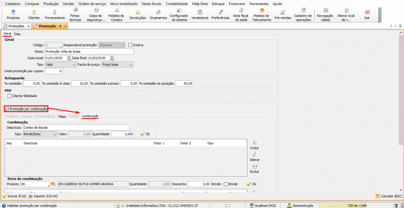 Após realizar as configurações da área Combinação, selecione a combinação, na área Itens da combinação adicione itens que farão parte da promoção, e adicione um item que será brinde.