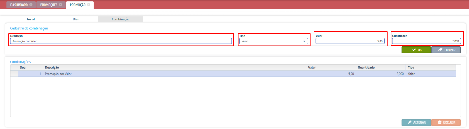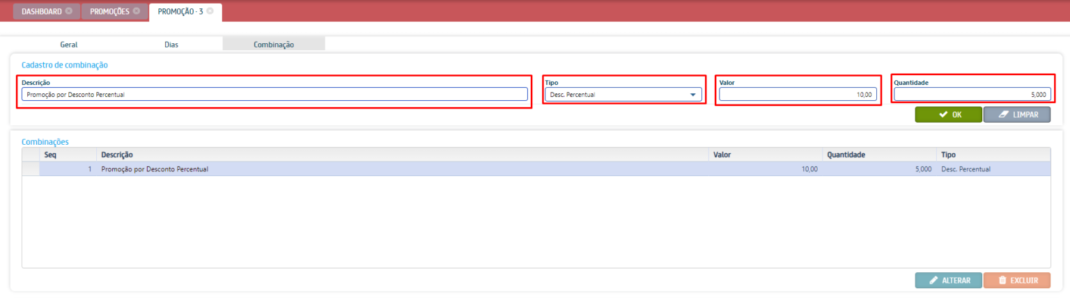 - Promoção por combinação: habilita a promoção por combinação.