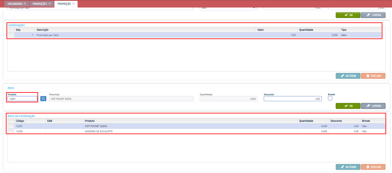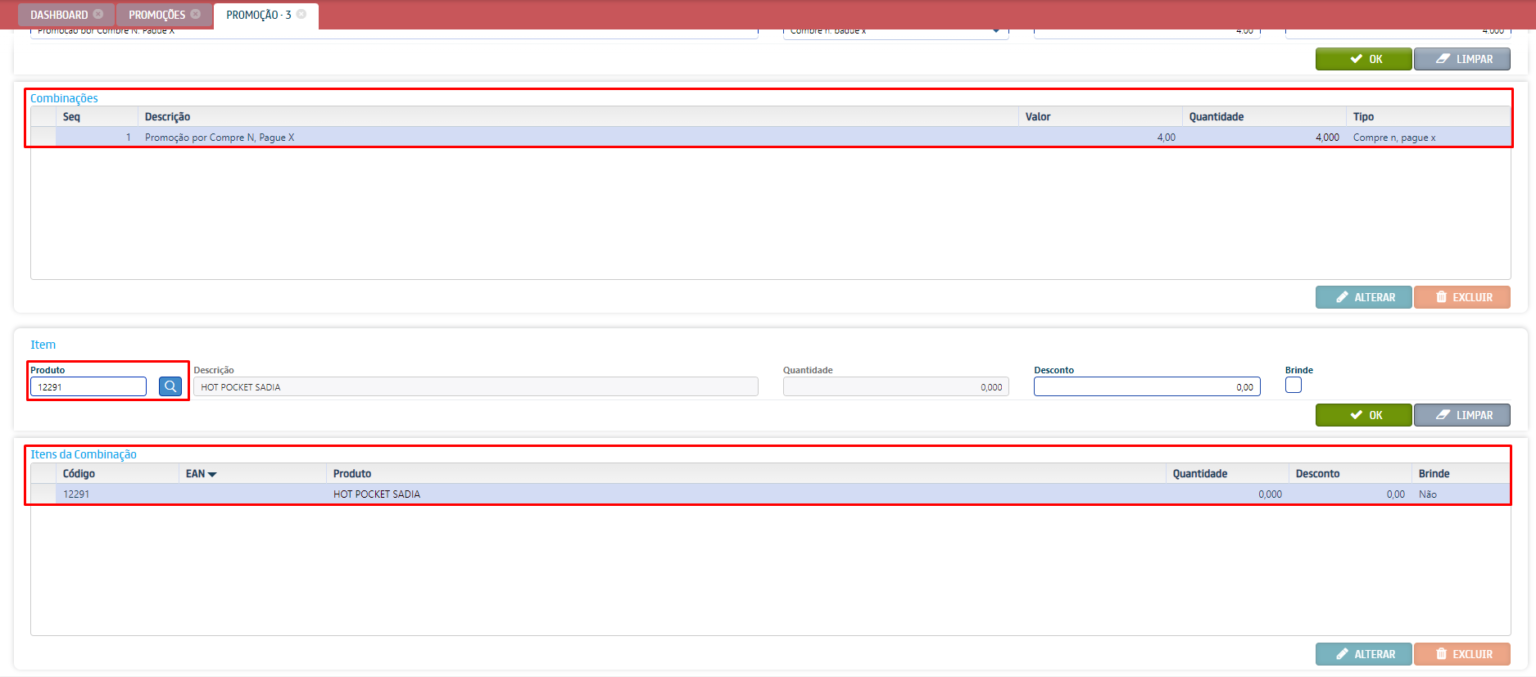 Após realizar as configurações da área Combinação, selecione a combinação e na área Itens da combinação adicione itens que farão parte da promoção.