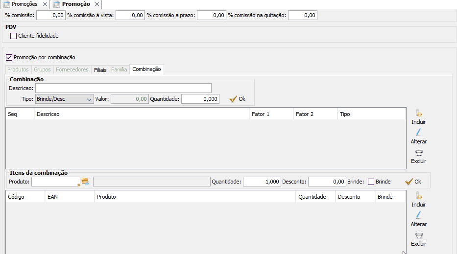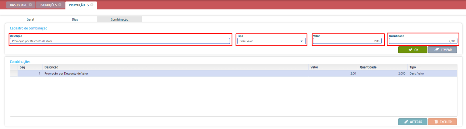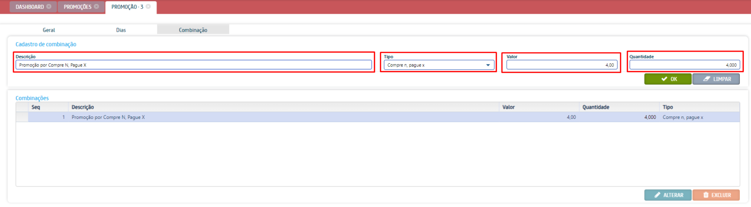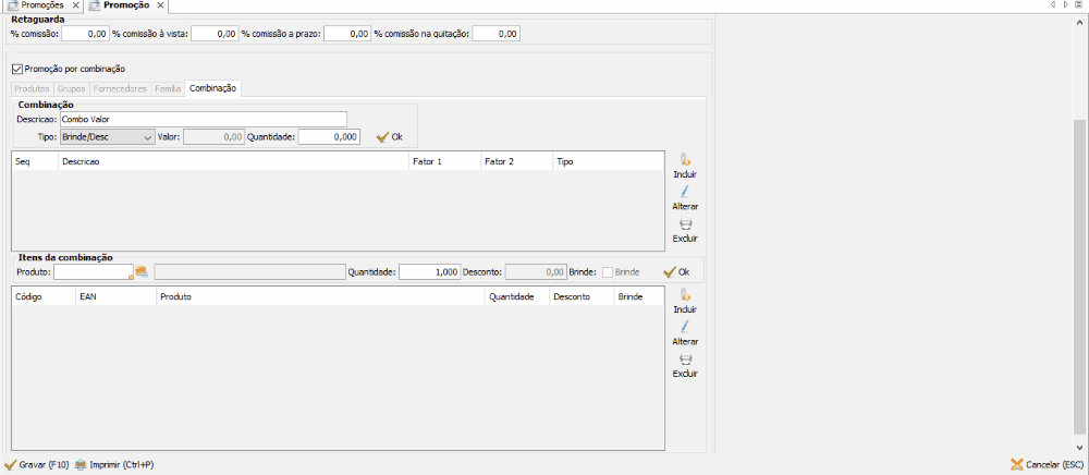 - Promoção por combinação: habilita a promoção por combinação que é utilizada quando 2 ou mais itens são comprados em conjunto.