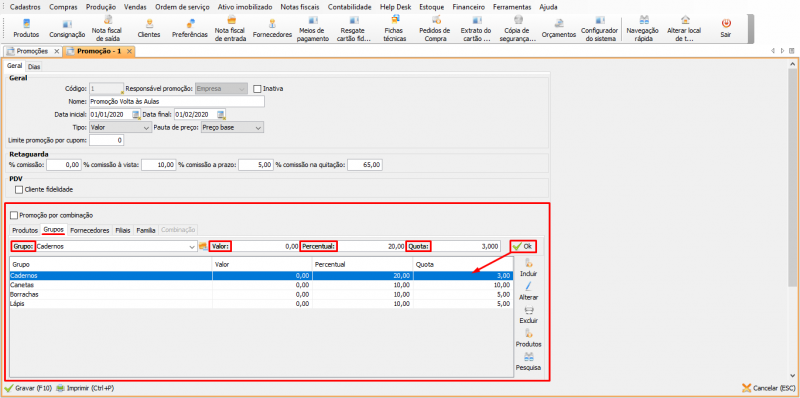 - Percentual: informe o percentual de desconto que será dado para esse produto.