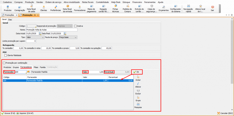 1- Na aba Fornecedores, há dois métodos de adicionar um fornecedor na promoção: desconto no valor e desconto percentual. Nesse exemplo será usado o método de promoção valor. Ao preencher um dos campos, o outro será desabilitado. Faça então as seguintes configurações: