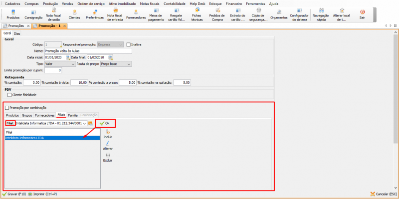 - Filiais: selecione em quais filiais será aplicada a promoção (é possível selecionar mais de uma).