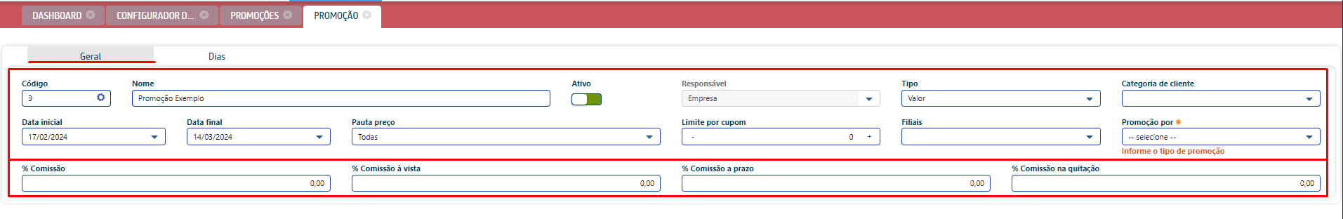- Tipo: selecione o tipo de promoção;