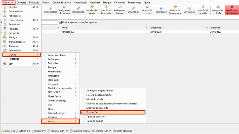 Agora, em Cadastros → Outros → Vendas → Promoções, selecione uma promoção já existente ou clique em [Incluir (F2)] para cadastrar uma nova promoção:
