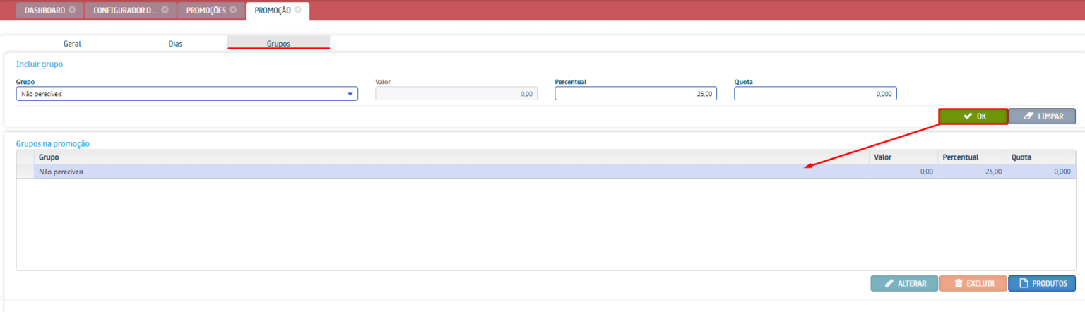 Esta promoção é aplicada em grupos de produtos e, consequentemente, em seus respectivos produtos. Para adicionar essa promoção, siga os passos a seguir: