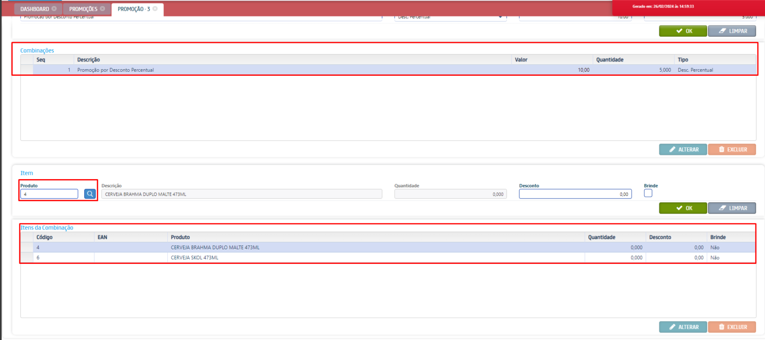 Após realizar as configurações da área Combinação, selecione a combinação, na área Itens da combinação adicione itens que farão parte da promoção.