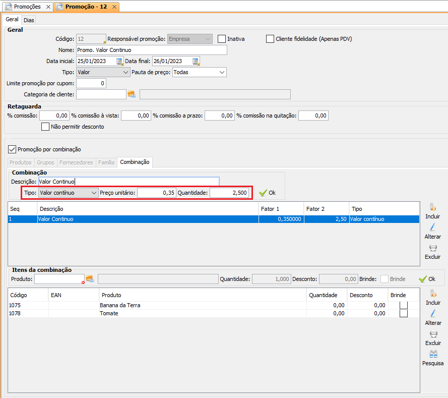 O Tipo Valor Contínuo atribui o preço unitário à uma combinação de produtos, ou seja, quando a quantidade mínima dos produtos for atingida, cada item da promoção terão seu preço unitário definido.