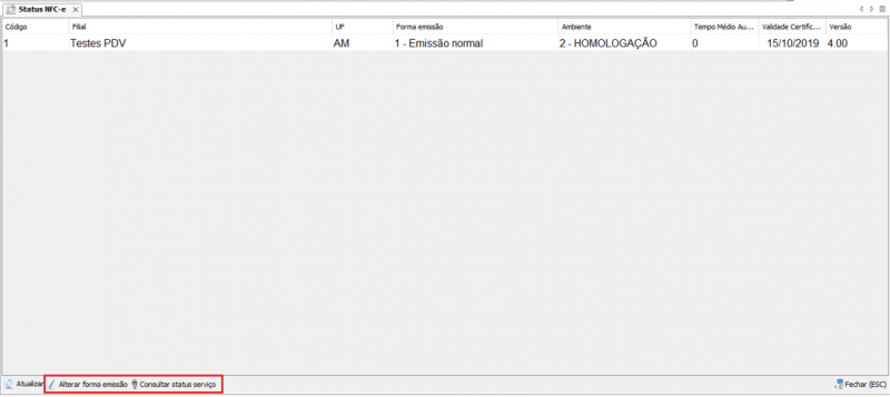 5- Para verificar o status da NFC-e, no Uniplus acesse: Cadastros → NFC-e/SAT → Status NFC-e, nessa tela é possível Alterar a forma de emissão e também Consultar status de serviço: