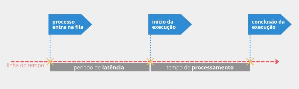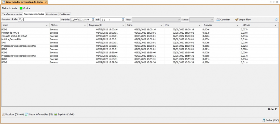 - Latência: indica quanto tempo passou entre a data/hora da programação da tarefa e a data/hora do início da execução (fórmula de cálculo: Início – Programação = Latência).