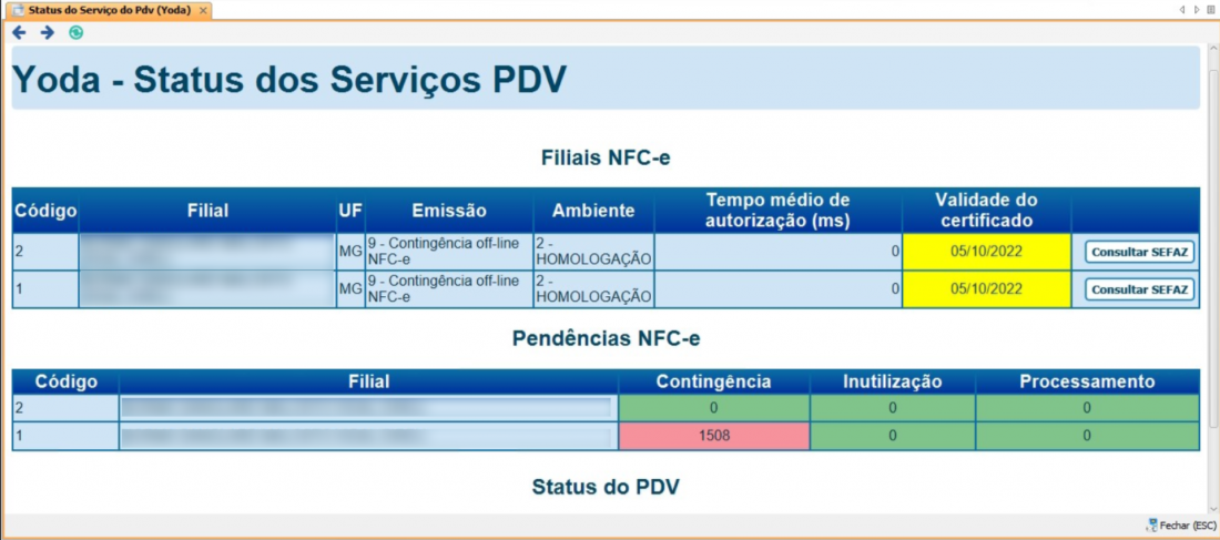 Também é possível visualizar o Status dos Serviços PDV através do navegador. Para isso, no endereço digite o IP do servidor, seguido de “:8081” (por exemplo: “10.1.13.28:8081”). O navegador vai mostrar algo parecido com a próxima imagem: