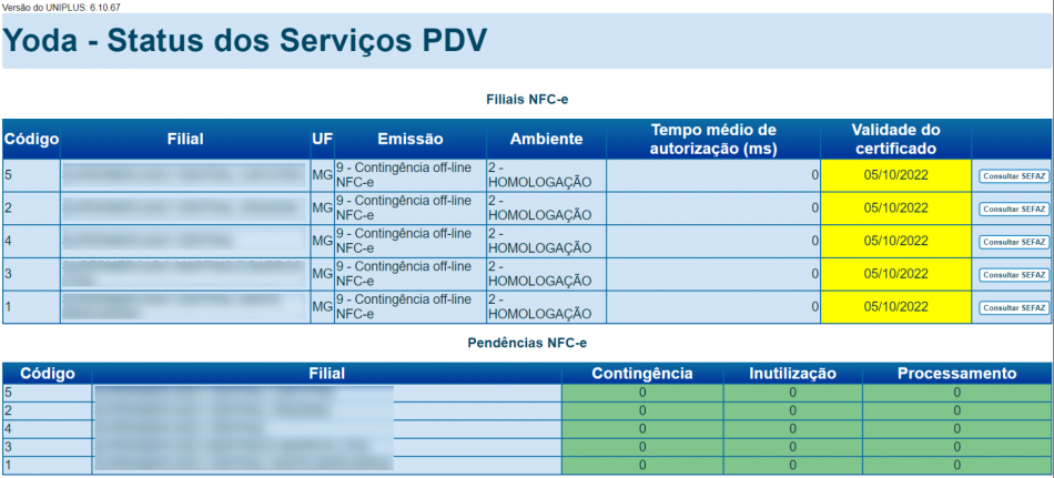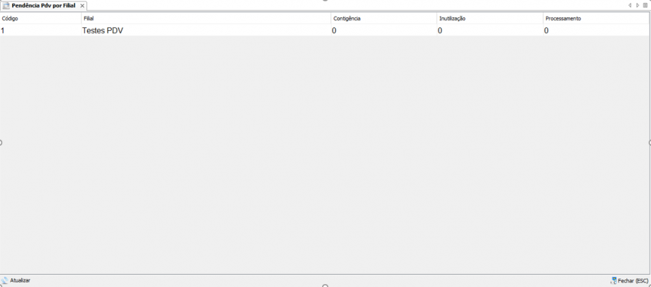 6- Para verificar se há pendências no PDV, no Uniplus, acesse: Cadastros → Outros → PDV → Pendência Pdv por filial, nessa tela será possível visualizar se há: contingências, inutilizações e processamentos pendentes por filial.