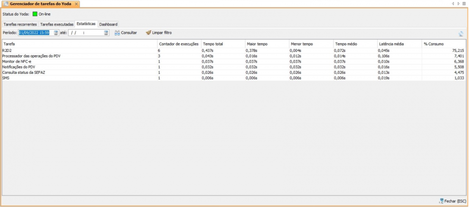 - Aba Estatísticas: essa grid apresenta dados estatísticos sobre as tarefas exibidas. Perceba que é possível aplicar um filtro definindo melhor o período de verificação.