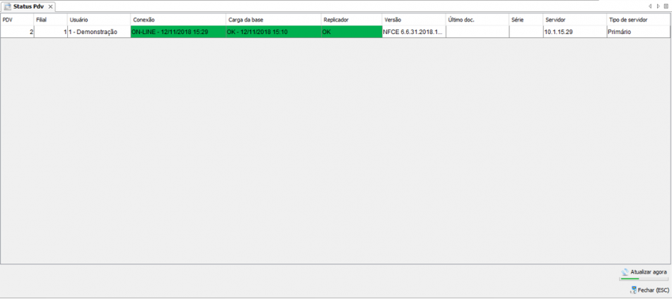 4- Com o Servidor Yoda, é possível verificar o Status do PDV. No Uniplus acesse: Cadastros → Outros → PDV → Status Pdv, nessa tela, será possível visualizar informações como: estações que estão conectadas, o usuário conectado, o último documento emitido, a versão do PDV, etc.