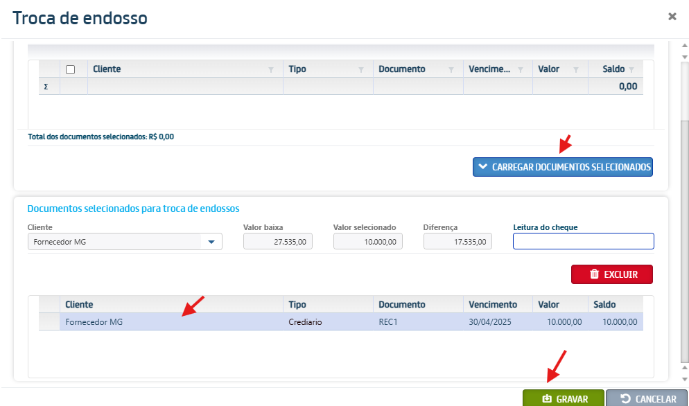 Na tela de Troca de endosso que será apresentada Selecione os documentos do contas a receber, clique em [Carregar Documentos Selecionados] e clique em [Gravar].