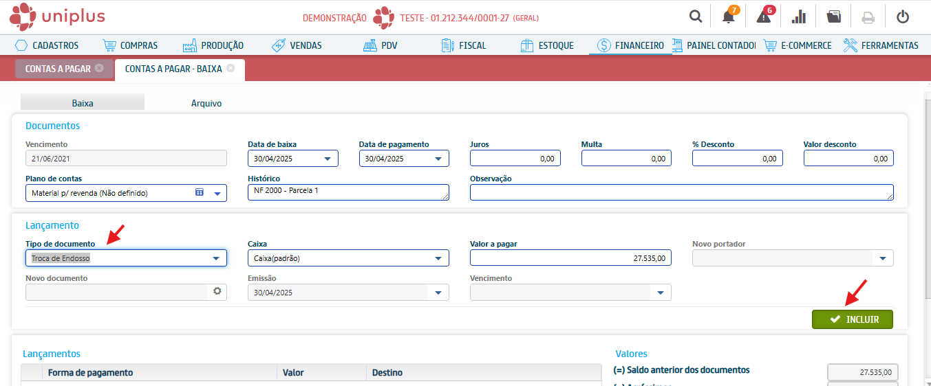 Na baixa do documento, opção Tipo de documento, selecione Troca de Endosso, preencha os demais campos e clique em [Incluir]: