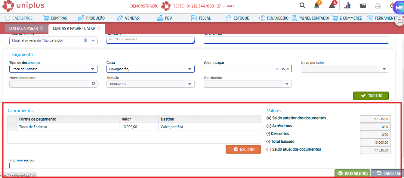 Acesse o Uniplus, no menu Financeiro → Geral → Contas a pagar, com o documento selecionado, clique em [Baixar].