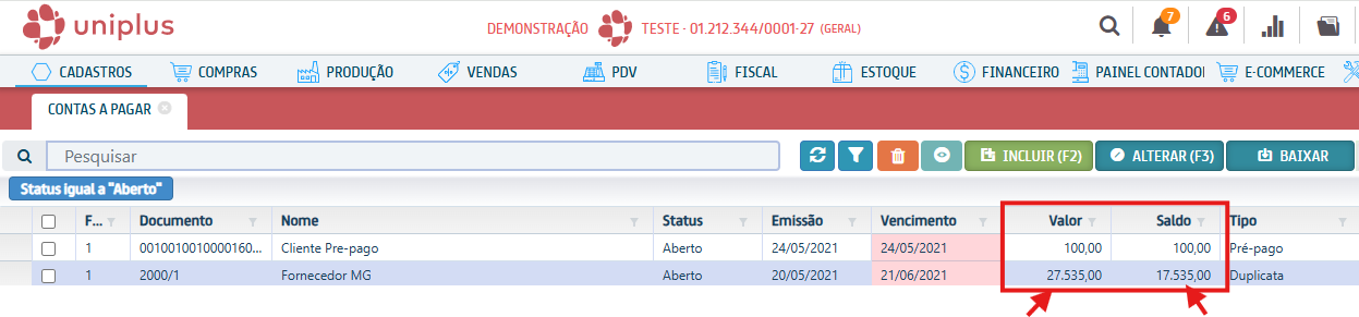 Na grid principal do contas a pagar será apresentado as colunas de Valor e Saldo:
