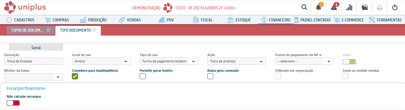 No Uniplus no menu Financeiro → Outros → Tipos de documentos financeiros → [Incluir (F2)], faça as seguintes configurações: